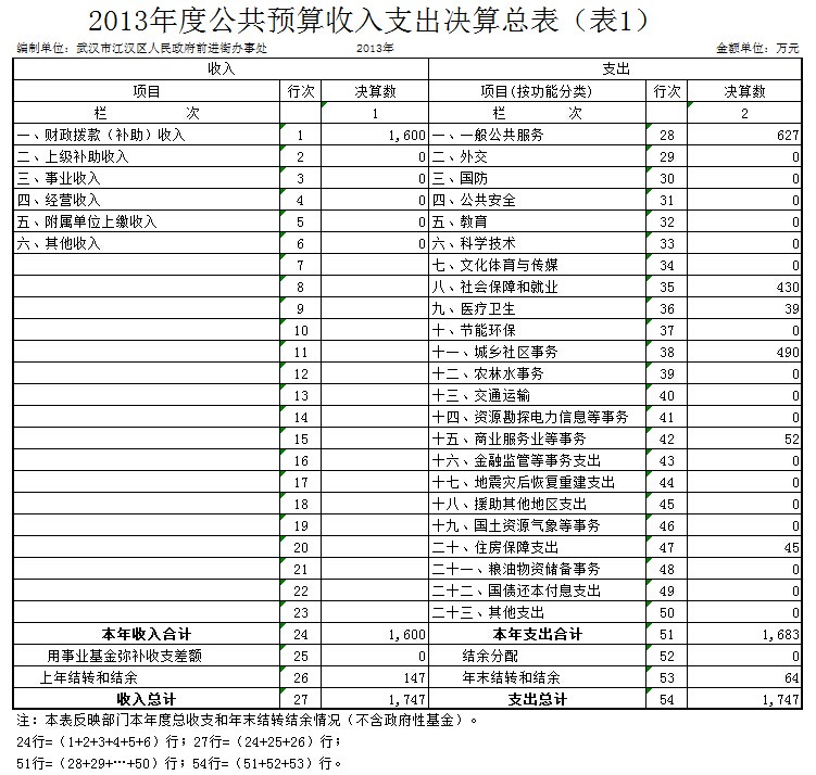 武汉市江汉区人民政府前进街办事处2013年收入总计1,747万元,其中:本年收入合计1,600万元,上年结转和结余147万元;支出总计1,747万元,其中:本年支出合计1,683万元,年末结转和结余64万元。