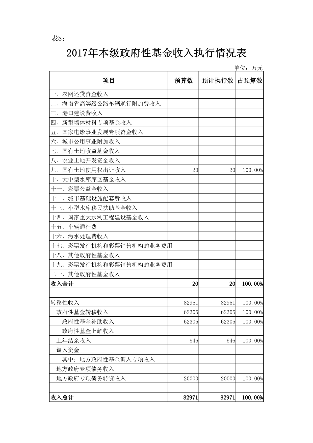 全年预计执行情况为:本级政府性基金预算收入总计8.3亿元,其中:本级政府性基金预算收入20万元,为预算的100%;转移性收入8.3亿元(包括土地使用权出让收入6.07亿元、政府专项转贷债券收入2亿元、其他转移支付收入0.23亿元)。本级政府性基金预算支出总计8.3亿元,其中:本级政府性基金预算支出6.49亿元(包括城乡社区事务支出6.3亿元、其他支出0.19亿元),为预算的100%;安排预算稳定调节基金1.81亿元。