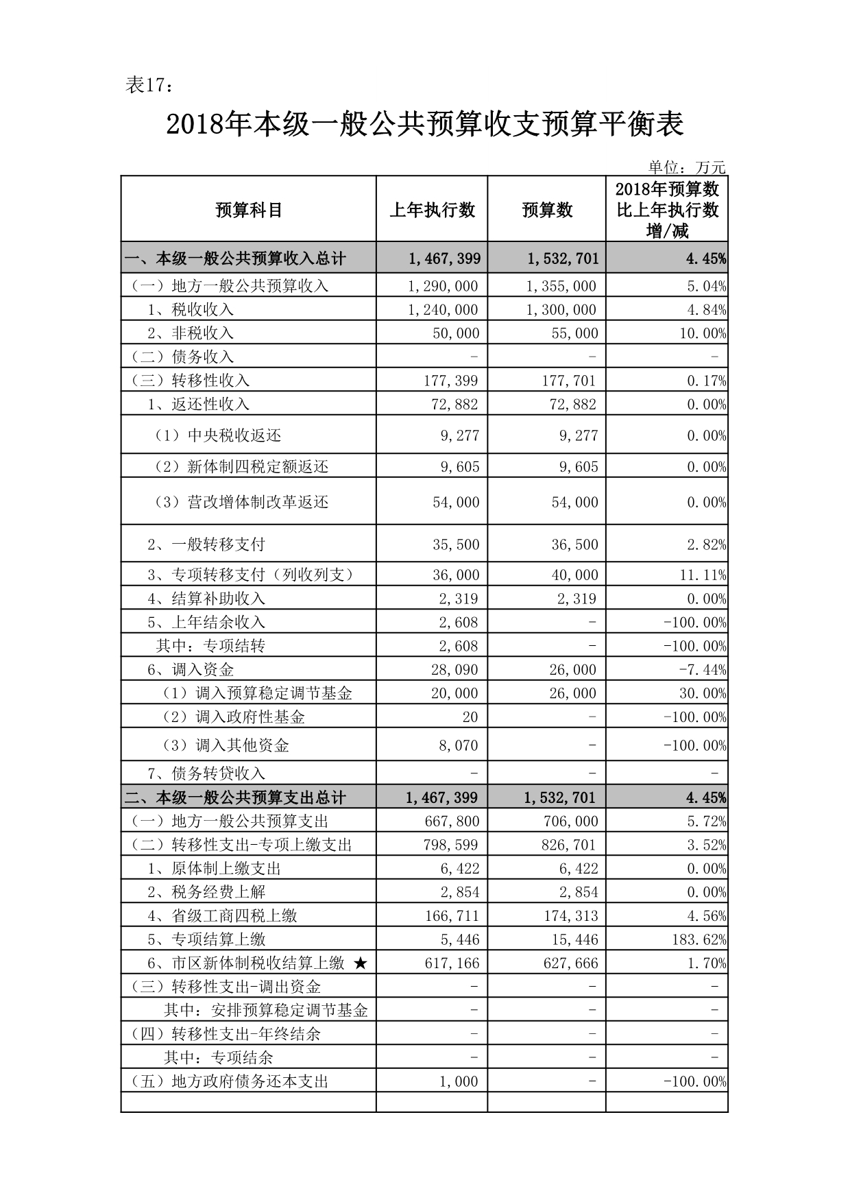 2018年,本级一般公共预算收入总计153.27亿元,其中:地方一般公共预算收入135.5亿元,上级返还性收入和转移支付收入15.17亿元,调入预算稳定调节基金2.6亿元。