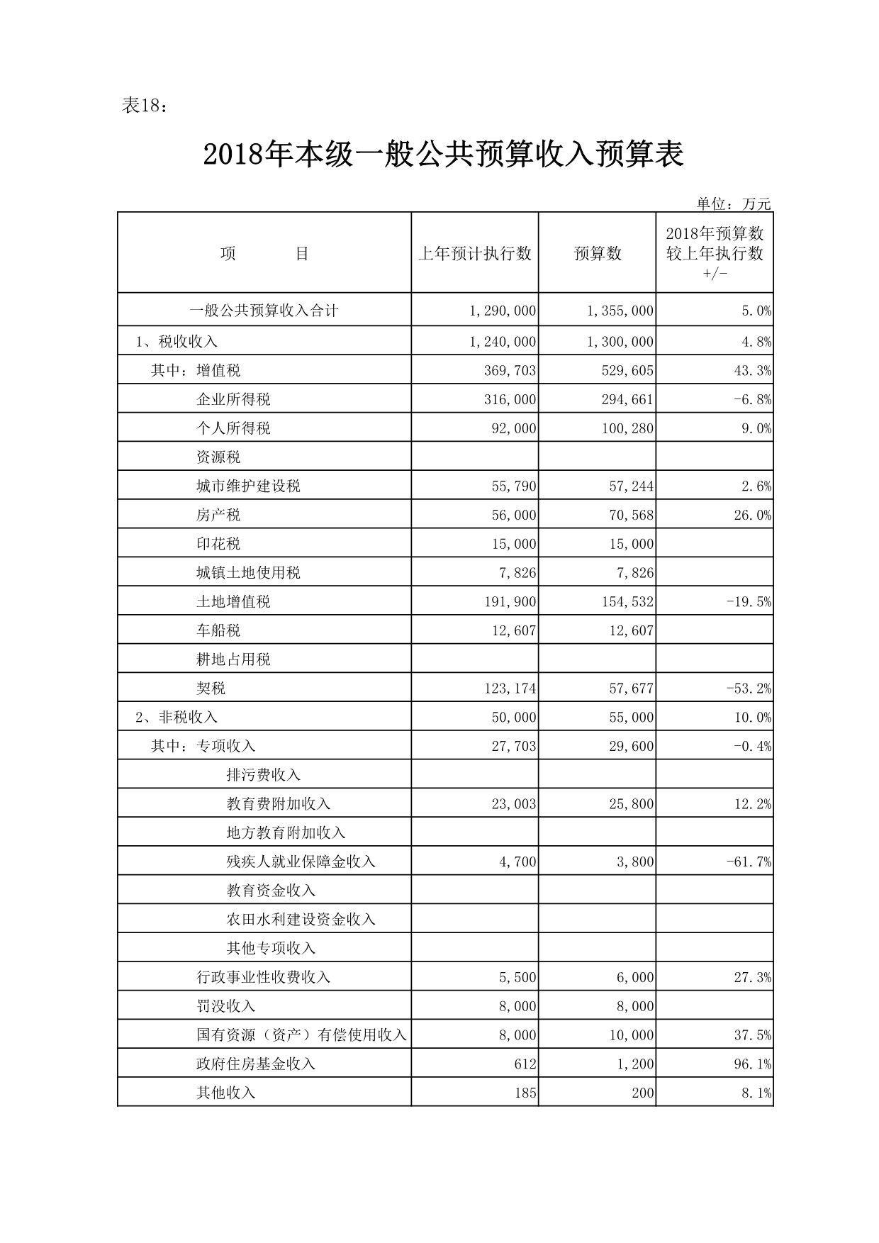 2018年,一般公共预算总收入249亿元,比上年预计执行数(以下简称“同比”)增长7.3%;地方一般公共预算收入135.5亿元,同比增长5%,其中:税收收入130亿元,同比增长4.8%,非税收入5.5亿元,同比增长10%。