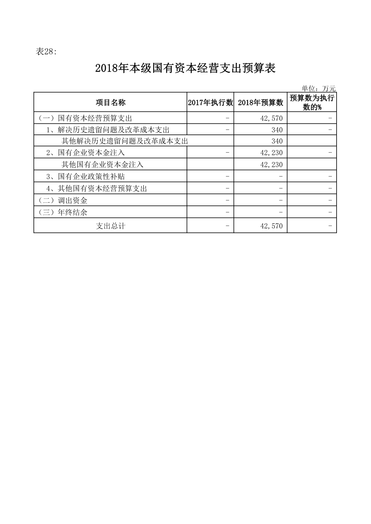 2018年,国有资本经营支出预算为4.26亿元,包括:解决历史遗留问题及改革成本支出340万元;国有企业资本金注入支出4.22亿元,重点用于宏图雅居地块、机场二通道地块、黄陂天成药业地块等项目开发建设。
