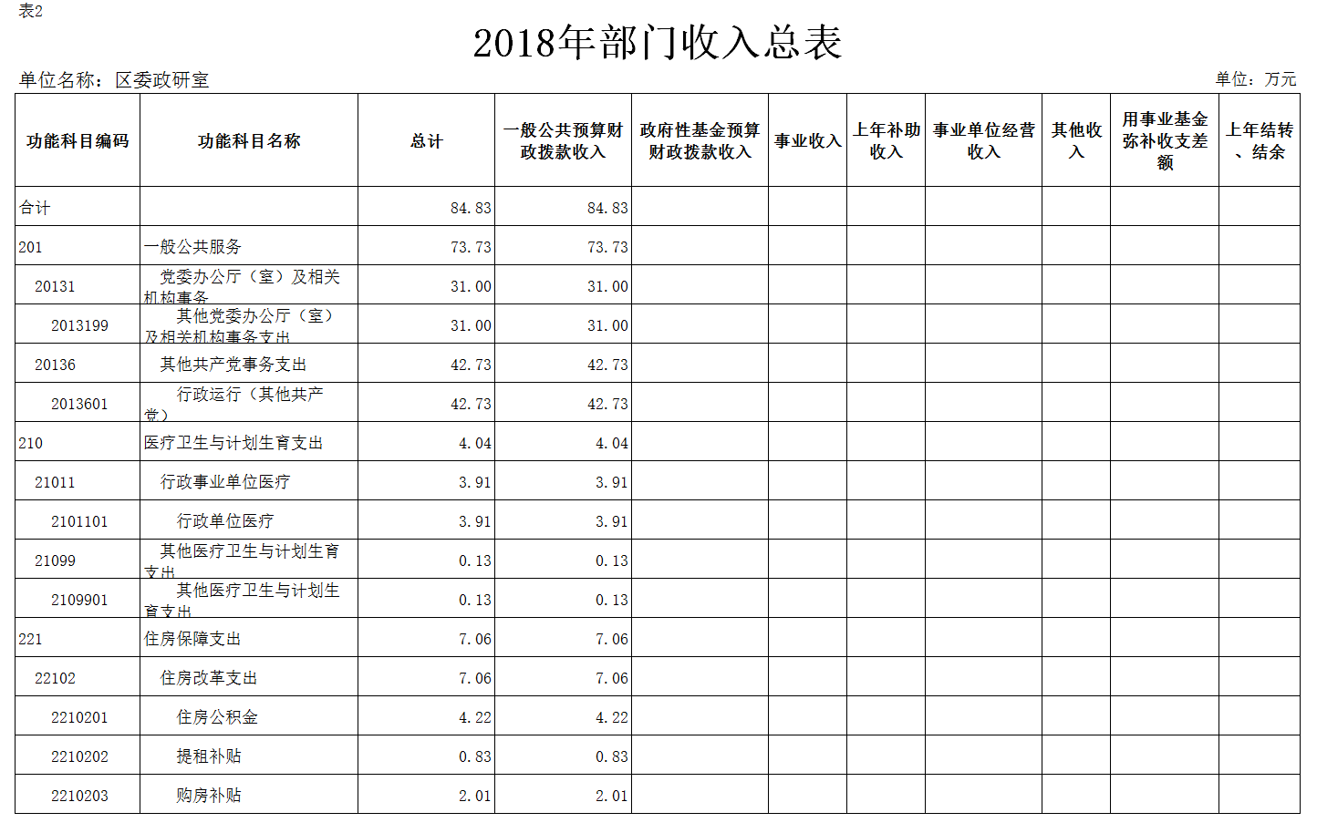 2018年部门预算总收入84.83万元,较2017年年初预算减少7.67万元,减少9.3%。其中:一般公共预算财政拨款(补助)收入84.83万元,其他收入0万元,上年结转0万元。 ?????????????????????????????
