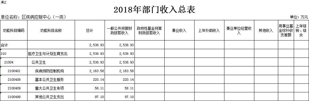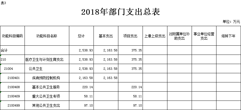 2018年部门预算总收入2538.93万元,较2017年年初预算减少757.25万元,其中:一般公共预算财政拨款(补助)收入 2538.93 万元,其他收入 0 万元.医疗卫生与计划生育支出:2538.93万元,疾病预防控制机构:2538.93万元。基本公共卫生服务2163.58万元;基本公共卫生服务:220.14万元;重大公共卫生专项:58.11万元,其他公共卫生支出:97.10万元。