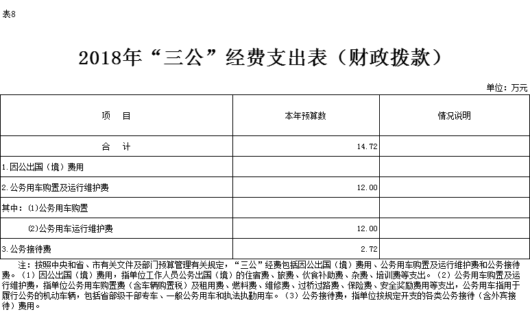 2018年部门财政拨款资金安排“三公”经费预算 14.72万元。三公经费金额为:14.72万元,其中公务招待费2.72万元。公车运行费12万元。具体情况如下: