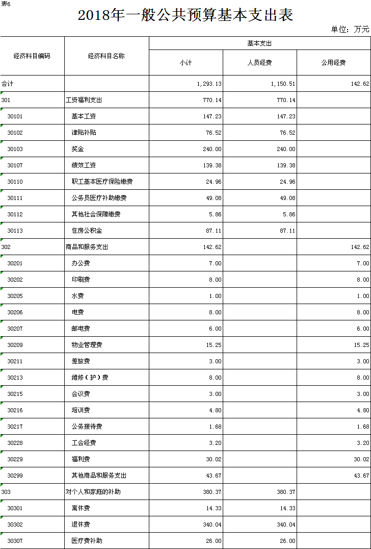 表 6.2018 年一般公共预算基本支出表