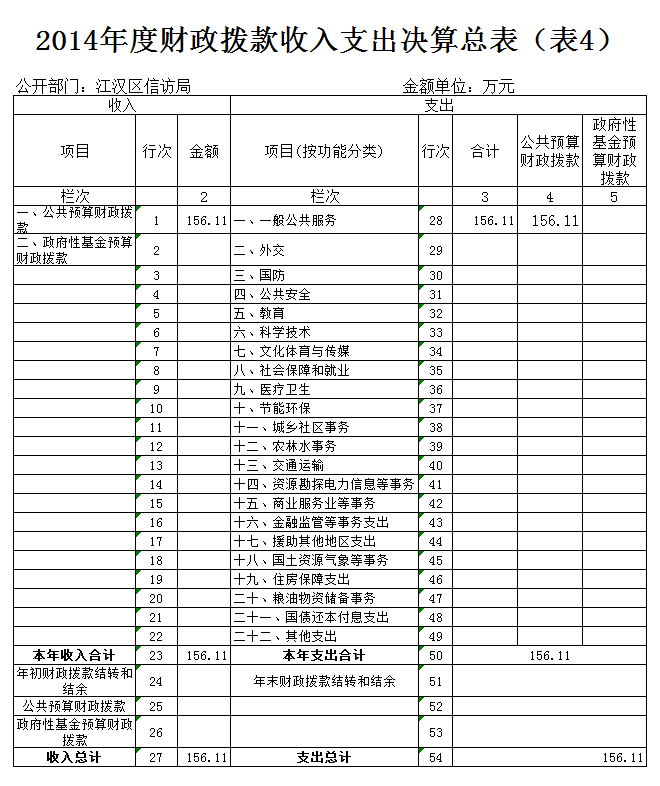 江汉区信访局2014年度本年收入合计156.11万元。其中:财政拨款收入(含政府性基金拨款)156.11万元,占本年收入100%。