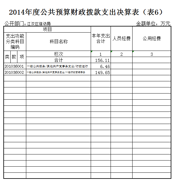 江汉区信访局2014年一般公共预算财政拨款支出年度预算为156.11万元(包括年初部门预算、基本建设等专项资金、上级下达的专项转移支付资金及年初结转和结余资金等支出),支出决算为156.11万元,完成年度预算的100 %。其中:基本支出6.46万元,主要成效:维护正常办公运转。聘用合同制工作人员经费32.33万元,主要成效:随着信访稳定工作量的不断增加,信访局人员明显不足,劳务派遣工作人员有效缓解了人员不足的压力。复查复核委员会经费5万元,主要成效:随着信访稳定工作量的不断增加,同一信访事项反复申诉,我区已成立复查复核委员会,复查复核委员会作为信访事项的终结及认定机构,并已组成专家库。复查复核委员会专家库的建立为我区信访事项三级终结提供必要的法律、政策支撑,为终结无理访、缠访、闹访提供依据,这一工作需持续开展。信访接待中心律师补贴0.52万元,主要成效:我区律师接待工作受到市信访局的肯定,每周的律师接待工作为信访工作提供了法律支持,为上访人提供了法律援助,促使我区信访工作更加依法依规。维稳专班工作经费60万元,主要成效:对上访群众提出的信访诉求进行调查、研判、督办。市下2013年财政与编制政务公开激励性转移支付资金0.5万元,主要成效:提供了有效的财政与编制政务公开查询,为便利群众查询提供服务;信访稳定经费51.3万元,主要成效:群众来访接待中心的日常运转,调查处理信访事项的沟通、联络、协调等工作,工作人员信访津贴(按照人社部发【2009】177号文件规定发放),每年对信访干部进行培训,提高信访干部的综合素质及业务能力。