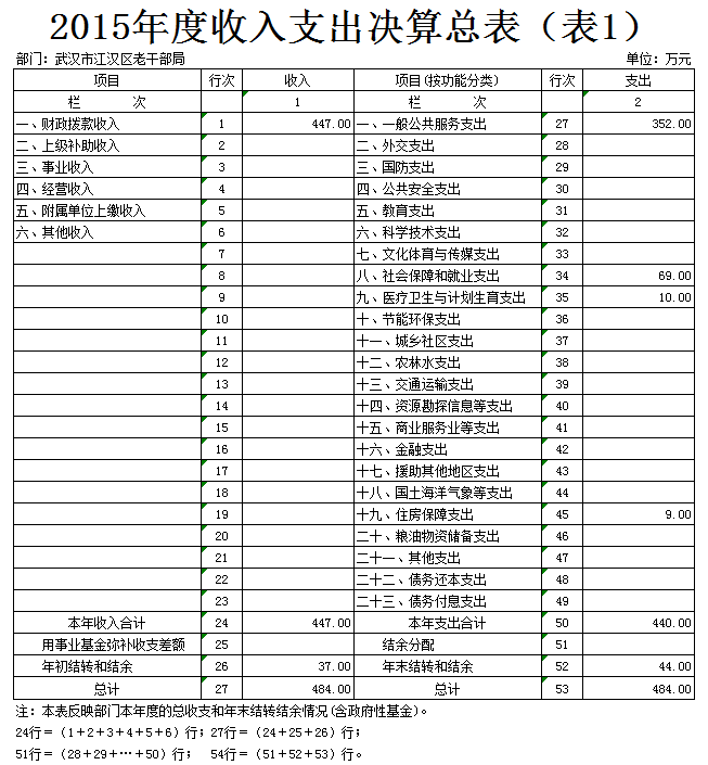 2015年度收入总计484万元,支出总计440万元。与2014年相比,收入增加134万元,主要原因是职工工资增加和老干工作经费提高。支出增加113万元,主要原因是职工工资增加和老干工作经费提高。