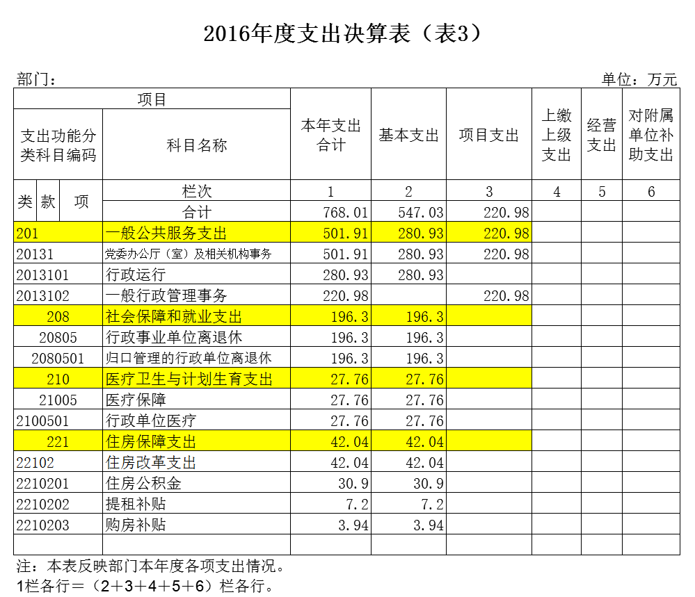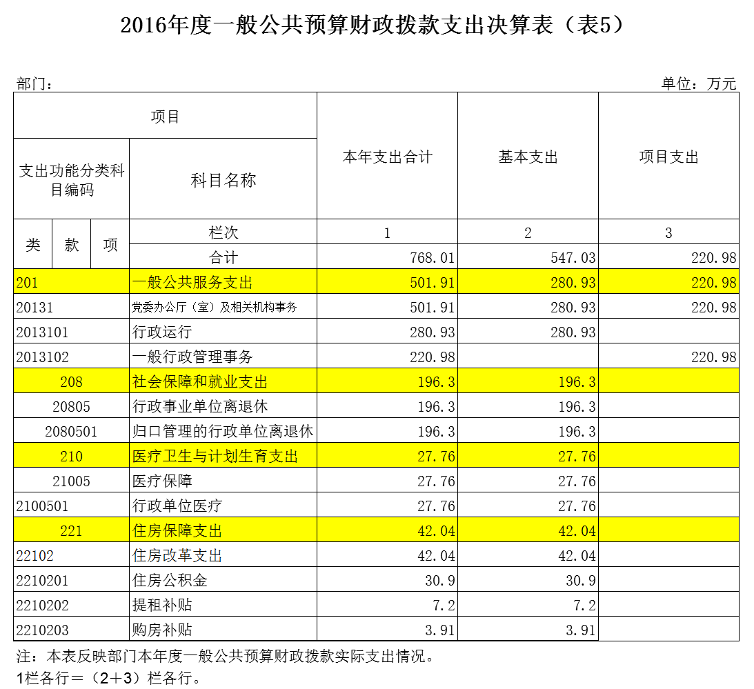 2016年度一般公共预算财政拨款基本支出 593.46 万元,其中,人员经费 520.27 万元,主要包括:基本工资、津贴补贴、奖金、社会保障缴费、绩效工资、其他工资福利支出、离休费、退休费、抚恤金、退职(役)费、抚恤金、生活补助、救济费、医疗费、助学金、奖励金、生产补贴、住房公积金、提租补贴、购房补贴、其他对个人和家庭的补助支出;公用经费 73.19 万元,主要包括:办公费、印刷费、咨询费、手续费、差旅费、因公出国(境)费、维修(护)费、租赁费、会议费、培训费、公务接待费、劳务费、公务用车运行维护费、其他商品和服务支出;