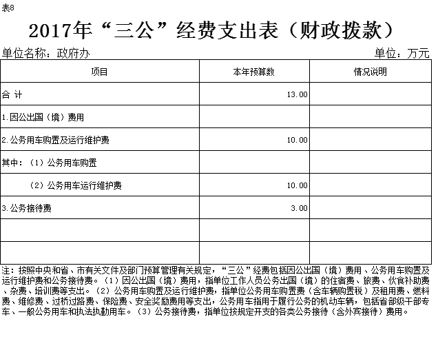2017年部门财政拨款资金安排“三公”经费预算13万元。具体情况如下: