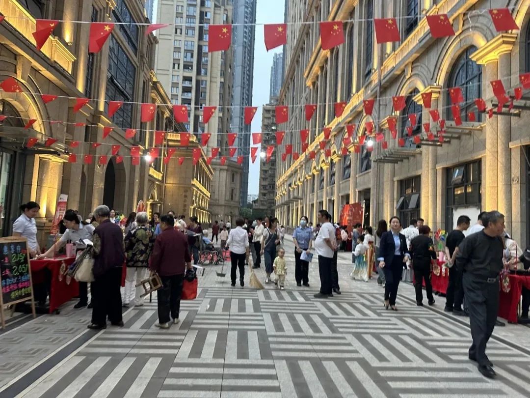 活动现场红旗飘飘,人头攒动,汉服灯笼等元素随处可见,喜庆热闹、喜气洋洋的节日氛围直接拉满。