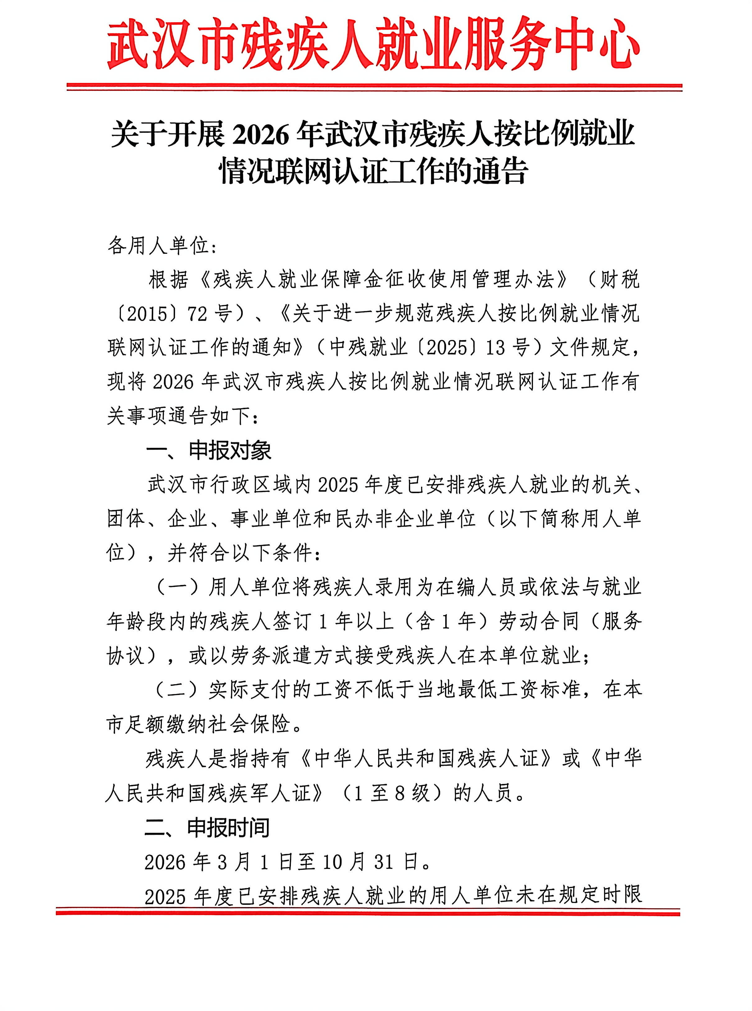 根据《残疾人就业保障金征收使用管理办法》(财税〔2015〕72号)、《关于进一步规范残疾人按比例就业情况联网认证工作的通知》(中残就业〔2025〕13号)文件规定,现将2026年武汉市残疾人按比例就业情况联网认证工作有关事项通告如下:
