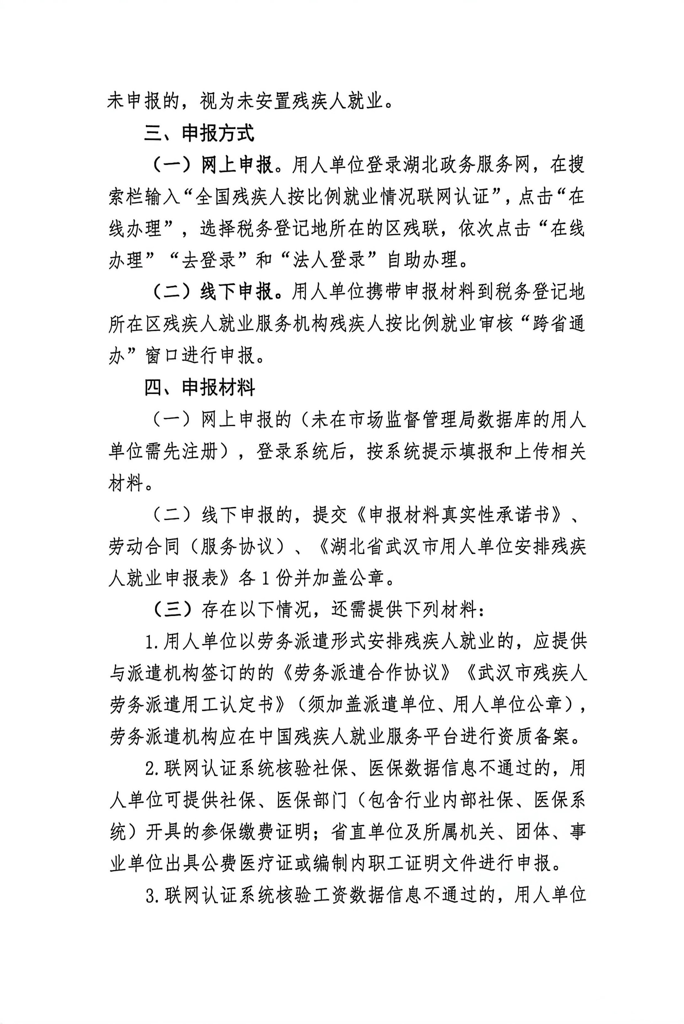 (二)线下申报的,提交《申报材料真实性承诺书》、劳动合同(服务协议)、《湖北省武汉市用人单位安排残疾人就业申报表》各1份并加盖公章。