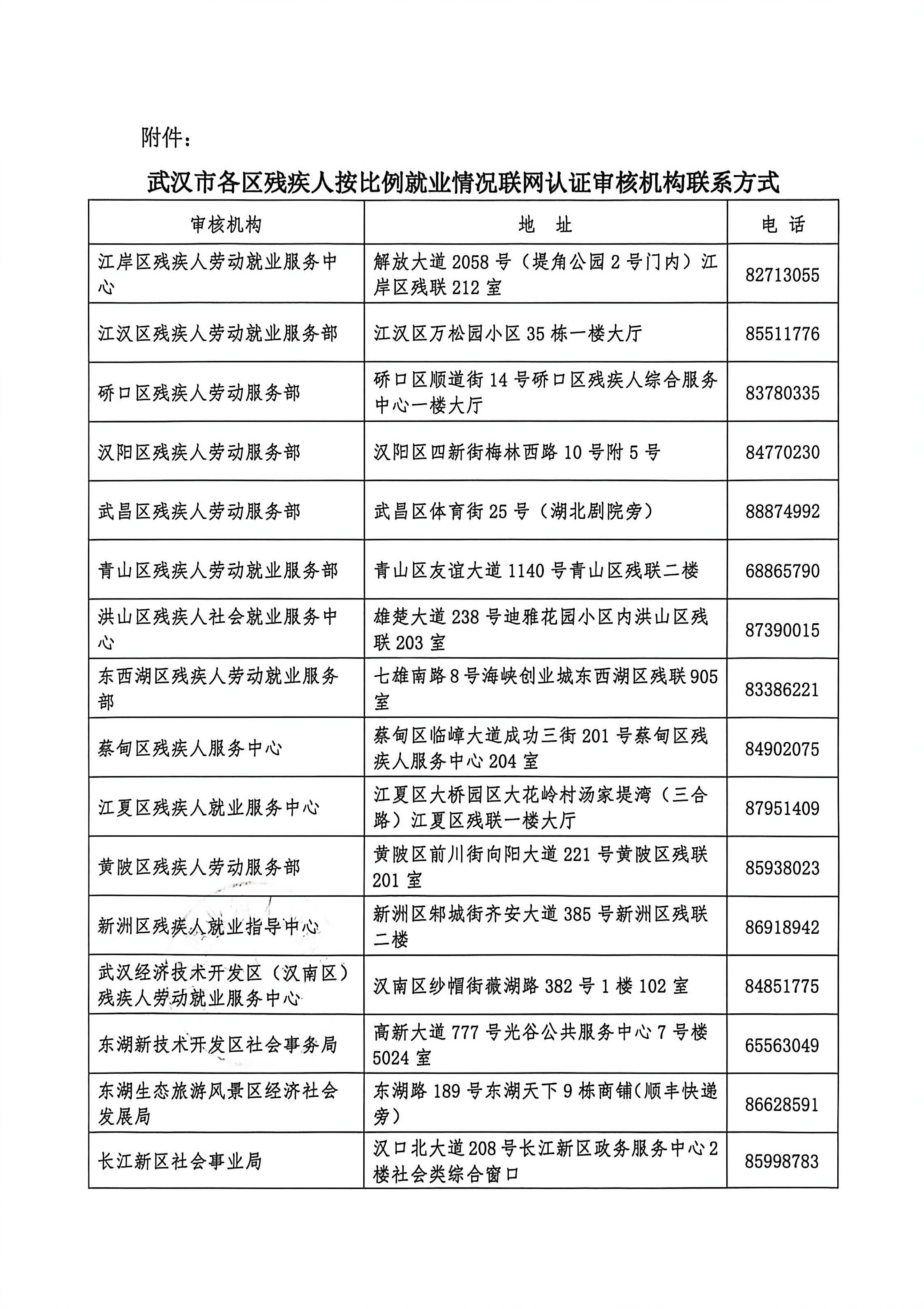 附件:武汉市各区残疾人按比例就业情况联网认证审核机构联系方式