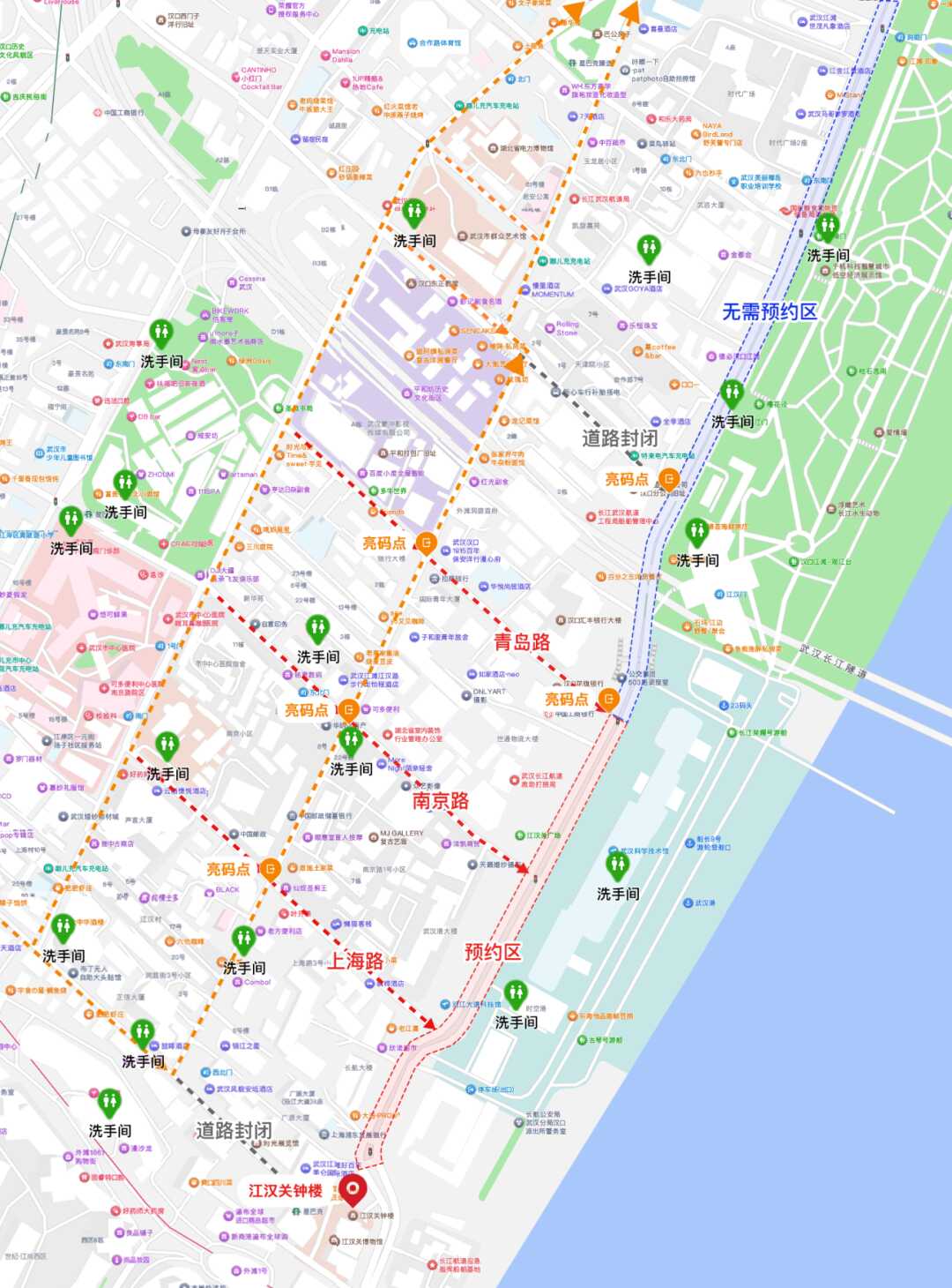 (三)活动当天,须携带电子预约凭证,按所预约时段有序入场。请在“亮码点”主动出示电子预约凭证,“亮码点”位于洞庭街与上海路、南京路、青岛路的交会路口,青岛路、天津路与沿江大道交会的水马拦截区入口(交通提示图上均已标注)。