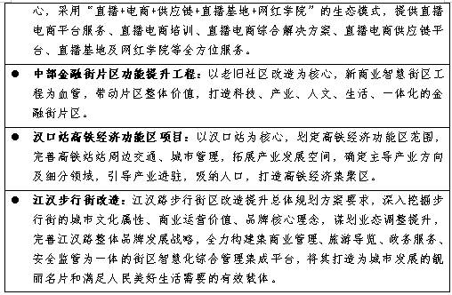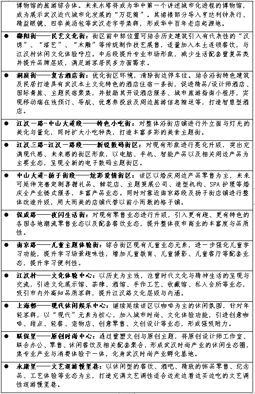 1、聚焦武汉国家商贸中心建设,打造国际消费城市中心核心区。承接武汉国家商贸中心发展目标,以武汉自贸区扩区为契机,加快自主创新步伐,发挥江汉商贸业的比较优势,优化招商引资结构,大力发展总部经济、楼宇经济,推进高端商贸业发展,壮大核心商圈,打造特色商业街区,将江汉打造成国际消费城市中心核心区。